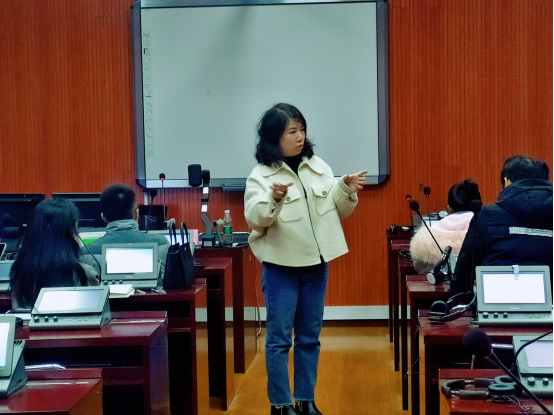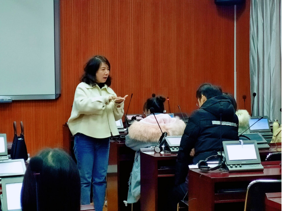 随后,王老师为同学们讲解了一些口译的基本概念,口译从形式上可分为交替传译(Consecutive Interpreting)、同声传译(Simultaneous Interpreting)、耳语同传(Whisper Interpreting)。其中同声传译相对出现较晚,从二战的国际法庭开始,因为需要进行多语种的同步传达,且需要借助设备的配合。同传的速度要求和源语的速度基本一致,不能落后源语太多,要使听的人感觉是有人在同步配音,这样,会议的效率就会大大提高。因此对同声传译的译员要求比较高。