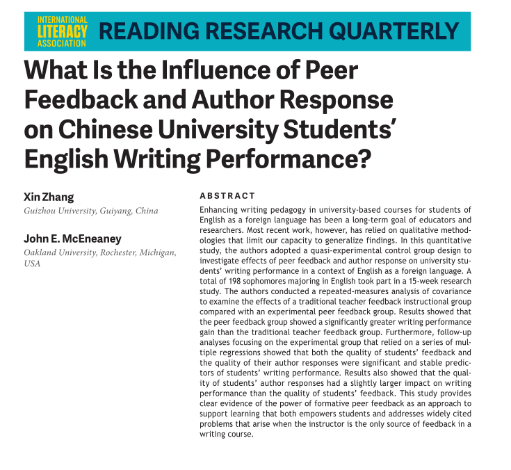 张馨博士作为第一作者和通讯作者在语言教育及心理学领域的SSCI一区国际学术期刊Reading Research Quarterly发表论文What Is the Influence of Peer Feedback and Author Response on Chinese University Students’ English Writing Performance ( DOI:10.1002/rrq.259, 2020年第55期), 全文共24页,期刊影响因子为3.69。该文创新性地提出了写作中的作者反馈过程,对大学生英语写作中的同伴互评和作者反馈模式进行了多因素定量分析和定性分析,进一步完善了写作的过程模型,并对未来的一语及二语写作的研究提供了新的思路。