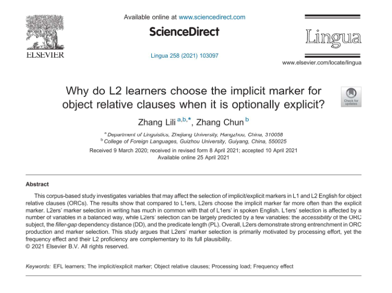 张丽丽博士和张春博士在语言学与普通语言学领域知名国际学术期刊Lingua发表论文Why do L2 learners choose the implicit marker for object relative clauses when it is optionally explicit?(DOI:10.1016/j.lingua.2021.103097,2021年第258卷), 全文共15页,期刊影响因子为0.719。该文基于二语者和母语者语料库,对可能影响英语宾语型关系从句隐性或显性关系词选择的潜在因素进行了比较研究,揭示了二语者和母语者之间所存在的差异及其动因,该文指出,加工负荷是两类群体在这一选择上的共同驱动因素,但频率效应和二语水平也是二语者选择的重要制约因素。
