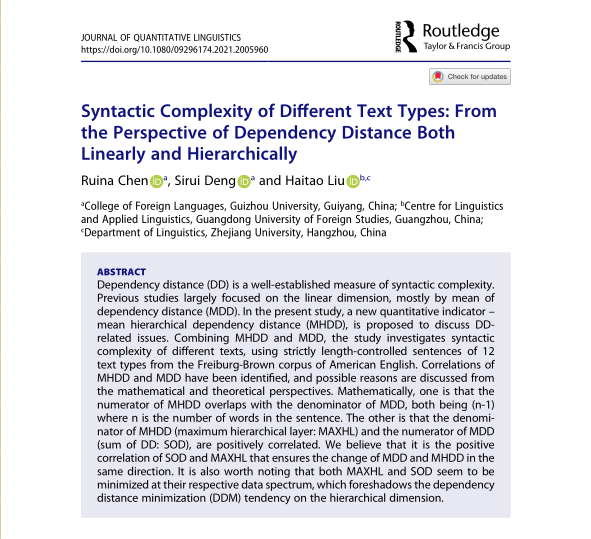 陈蕊娜博士作为第一作者在Journal of Quantitative Linguistics《计量语言学学报》发表学术论文Syntactic complexity of different text types: From the perspective of dependency distance both linearly and hierarchically(依存语法视域下英语不同文体句法复杂性研究---来自线性和垂直维度依存距离的考察)(DOI:10.1080/09296174.2021.2005960,2021年第4期),全文共32页,期刊影响因子为0.914。《计量语言学学报》是国际计量语言学学会的会刊,是计量语言学领域最重要的期刊之一,系SSCI 和A&HCI 期刊。该文是陈蕊娜的国家社科基金一般项目《英汉文本特征的计量语言学研究》(15BYY098)的部分成果。