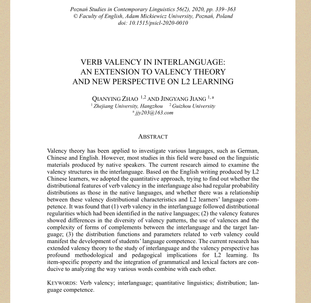 赵倩莹博士作为第一作者在SSCI国际学术期刊Poznań Studies in Contemporary Linguistics发表论文Verb Valency In Interlanguage: an Extension To Valency Theoryand New Perspectiveon L2 Learning(中介语中的动词配价:配价理论的发展与二语学习新视角)(DOI: 10.1515/ psicl-2020-0010, 2020年第56期),全文共25页,期刊影响因子为0.386。该文将配价理论应用于二语习得领域,利用计量的方法探究中介语中动词配价相关特征的分布规律与学习者二语水平之间的关系,为词汇搭配发展研究提供了新的启示。