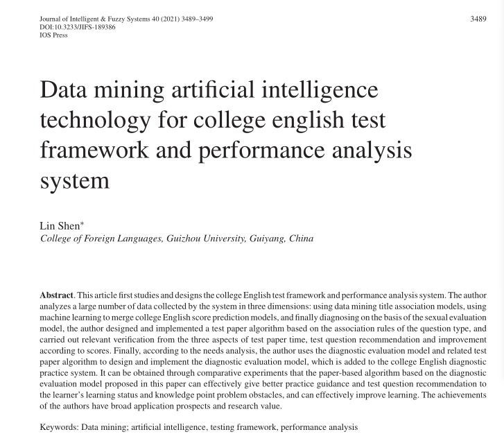 沈麟博士作为第一作者和通讯作者在人工智能领域权威国际学术期刊Journal of Intelligent & Fuzzy Systems《智能与模糊系统》发表论文Data mining artificial intelligence technology for college English test framework and performance analysis system(DOI: 10.3233/JIFS-189386,2021年第40期),全文共11页,期刊影响因子为1.851。该文从三个维度对现有我国大学英语考试框架和成绩分析系统收集到的大量数据进行了分析。通过对比实验以及数据挖掘和人工智能评价模型得出能有效对外语学习者学习状态和知识点问题障碍进行更好实践指导和测试试题推荐的一系列算法模式,该成果在学界具有广阔的应用前景和研究价值。
